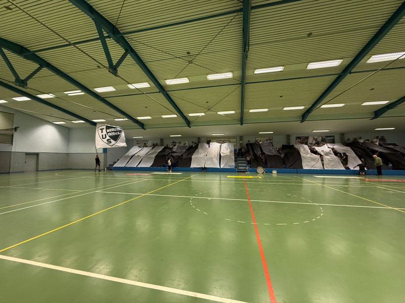 Zum Einlauf unserer Herrenmannschaft gab es über die gesamte Tribünenbreite hinweg eine riesige Choreographie in den Vereinsfarben. Zusätzlich wurde zum Ortslied „Weiwene Jong“ eingelaufen.