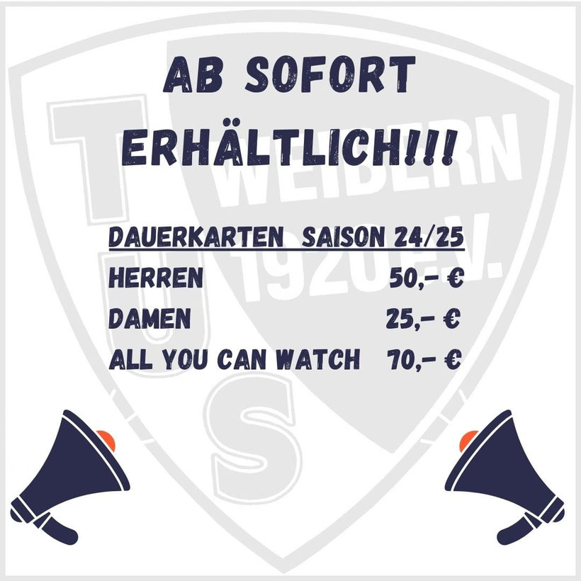 Ab sofort bietet der TuS für die Heimspiele der 1. Herren- sowie der Damenmannschaft Dauerkarten an. Wer alle Eintritte für die Spiele der 1. Herrenmannschaft und die der Damenmannschaft buchen will, kann eine komplette Saisonkarte (all you can watch) für 70,-- € erwerben.